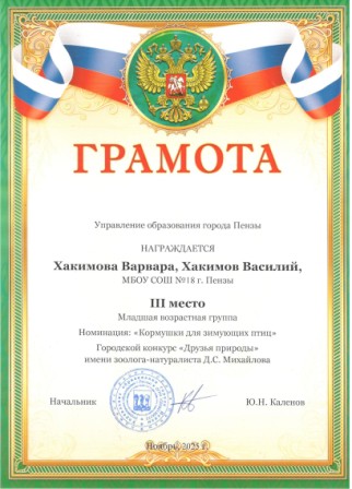 МБОУ ДО Д(Ю)Ц «Спутник» с целью привлечения внимания подрастающего поколения к охране окружающей среды, особенно к вопросам защиты зимующих видов птиц Пензенской области был проведен городской конкурс «Друзья природы» имени зоолога-натуралиста Д.С. Михайлова. Конкурс проходил по двум номинациям: «Кормушки для зимующих птиц» и рисунок «Зимующие птицы Пензенского края».