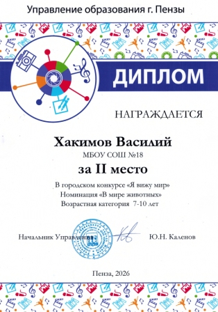2 место – Хакимов Василий – 4 «А» класс – номинация «В мире животных».