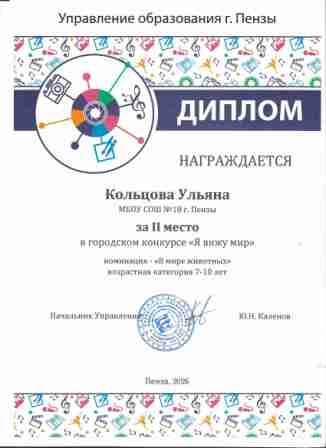 Подведены итоги городского фотоконкурса «Я вижу мир», организаторами которого выступили Управление образования г. Пензы и ДЮЦ «Звёздный». На конкурс было представлено более 300 фотографий из 17 учреждений города Пензы. Участники конкурса были поделены на 3 возрастные категории: младшую, среднюю и старшую. В каждой возрастной группе были представлены работы по номинациям: «Портрет», «Пейзаж», «Городской пейзаж», «Жанровый снимок», «Фоторепортаж», «В мире животных». Более 50 ребят стали победителями и призерами. Среди них обучающиеся нашей школы: