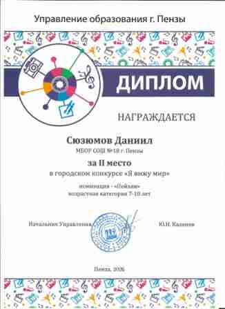 2 место – Сюзюмов Даниил – 4 «А» класс – номинация «Пейзаж»,